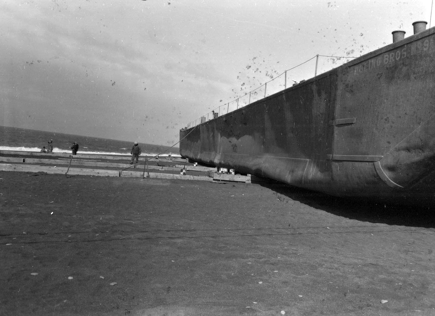 168k | A close up of Poling Brothers No. 9 towards the start of salvage operations. Sand has been dug out to allow jacks to raise the hull slightly off the surface of the beach. Note the distortion at the turn of the hull, presumably damage from being battered