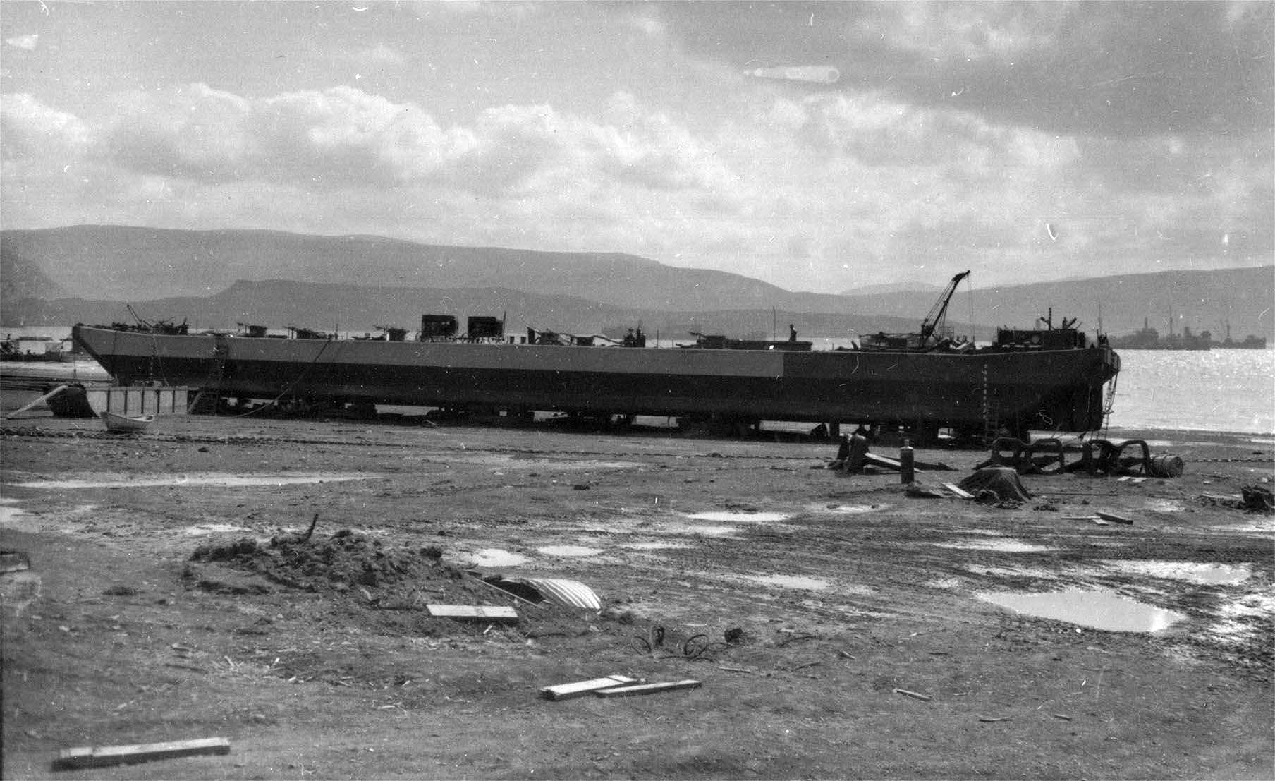98k | YO-155 on shore at Hvalfjordur, Iceland for repair following her tow by Redwing. Note the distortion to the sides of the barge presumably due to the force of the waves when she was aground.