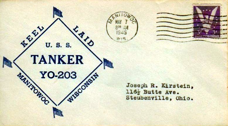 Postal cover commemorating the keel laying of YO-203, 7 May 1945, at Manitowc Shipbuilding, Corp., Manitowc, WI. US Navy photo. |