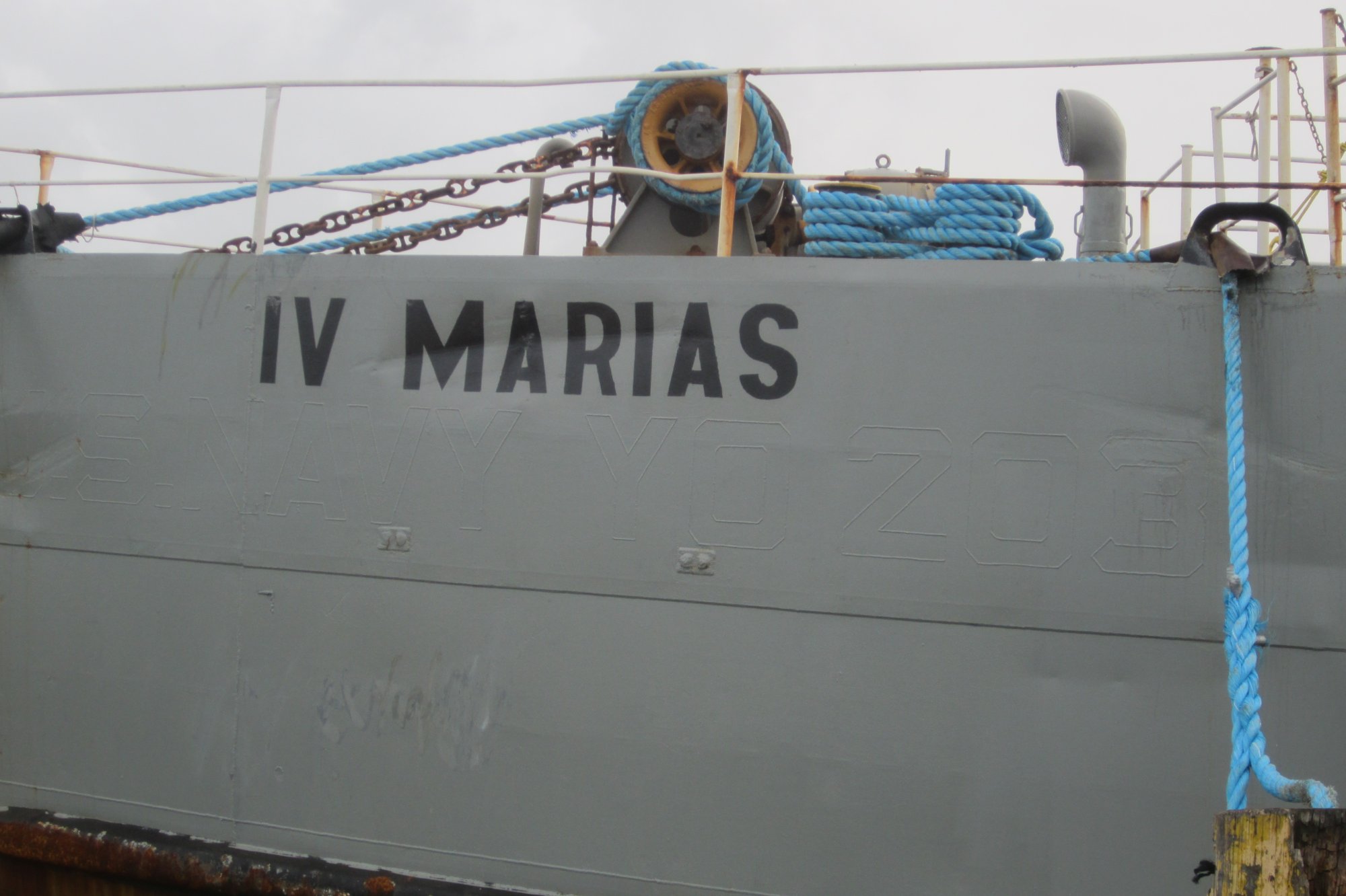 Ex-YO-203 in merchant service as IV Marias moored pierside at Puerto Cabezas, Nicaragua, July 2013. Note the navy designation YO-203 is still visible under her present paint work. |