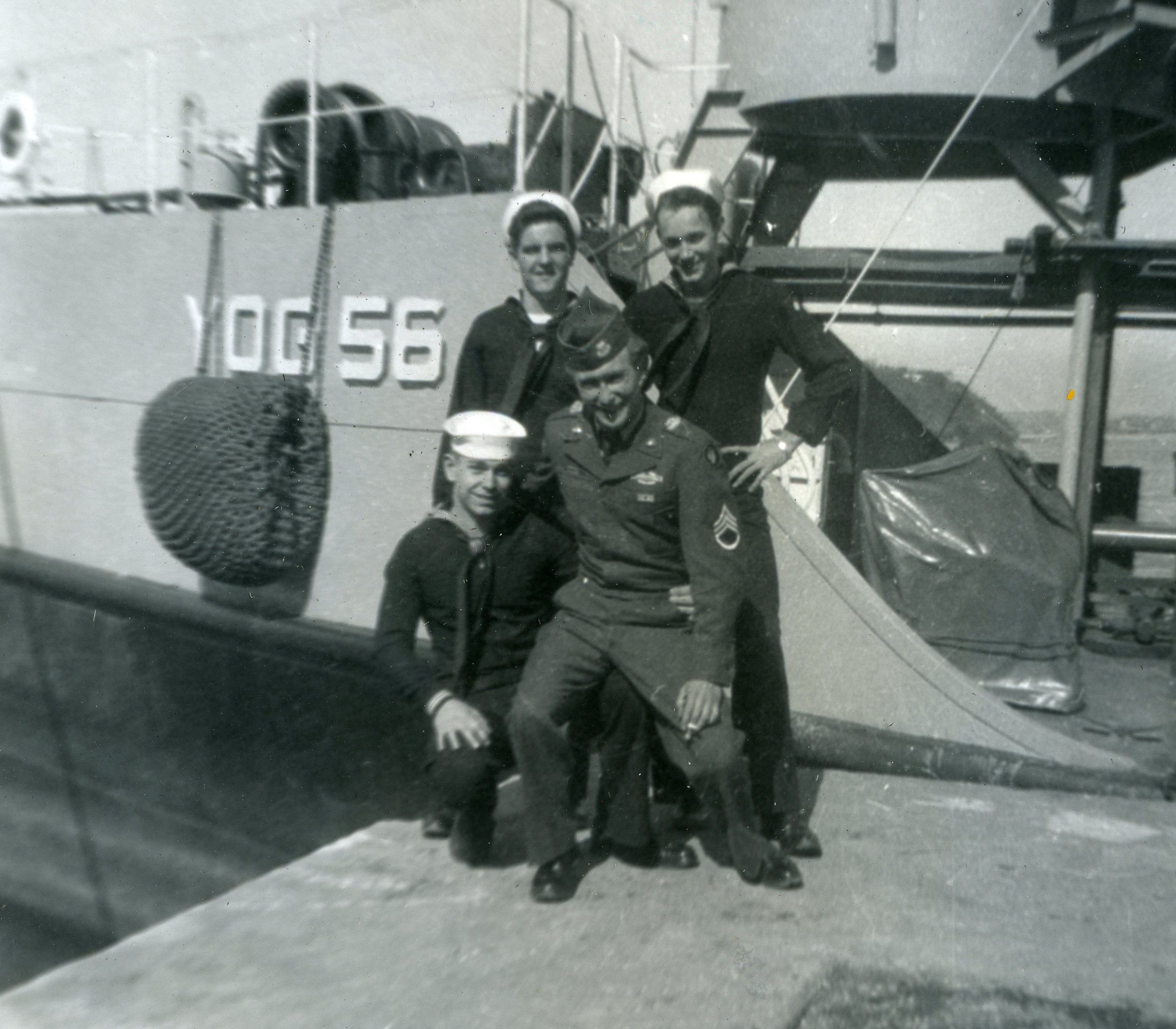 "My father, Ralph J. Mason (USS Oriskany) and his older brother, my uncle, PFC Thomas J. Mason... pictured in front of YOG-56... likely when Dad was on leave from the Oriskany to meet with his brother somewhere off the coast of Japan or China. On July 21, 1953... Thomas Mason died in a hospital unit near the front lines of the battle near Seoul, Korea... where his tank had been hit by enemy fire... only six days from the end of the Korean War.