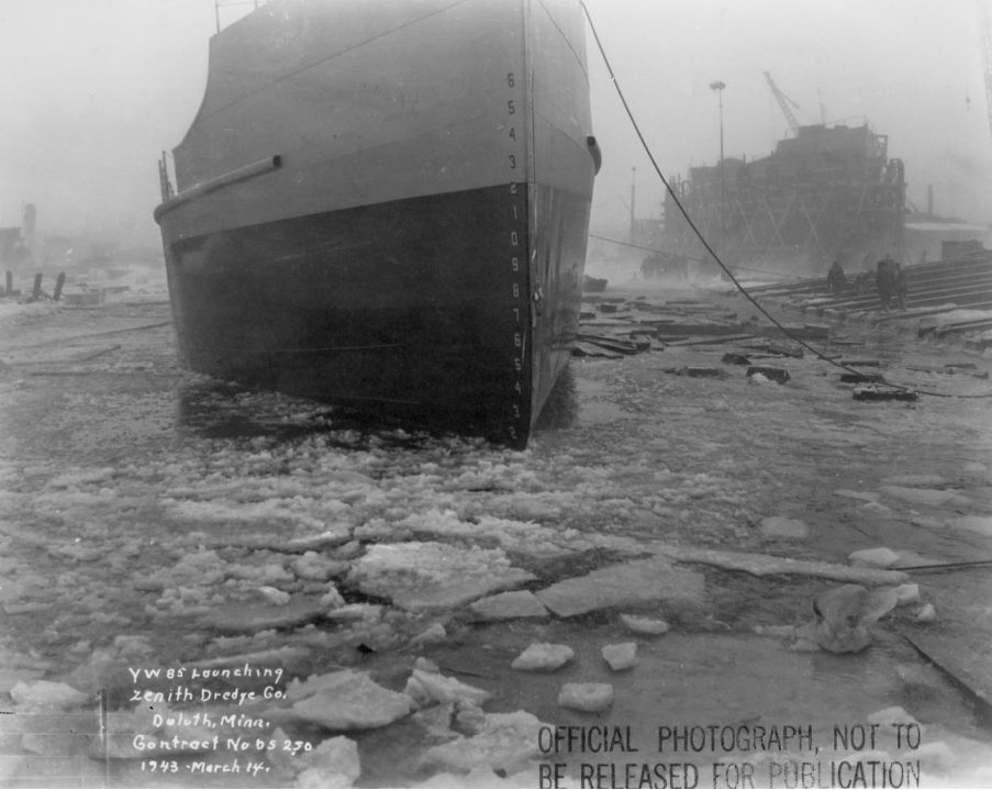 78k | YW-85 just after launching at Zenith Dredge, 14 March 1943. Photo from University of Wisconsin—Superior, Jim Dan Hill Library. |