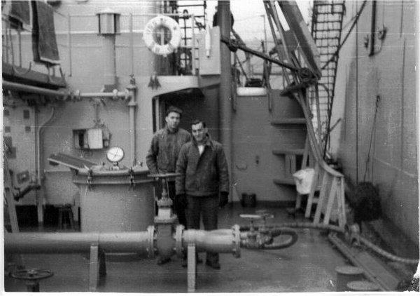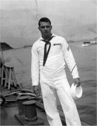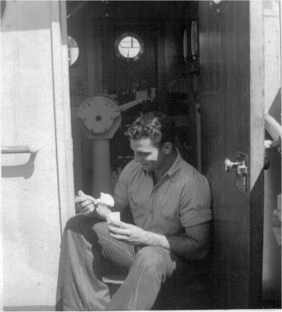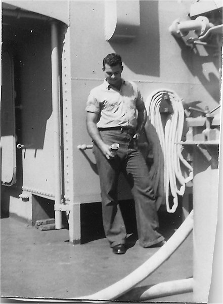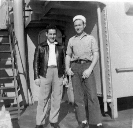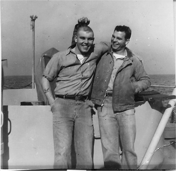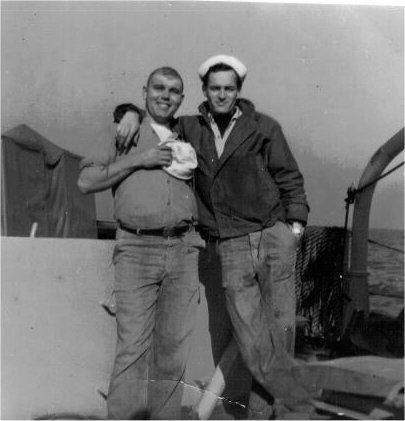 ![]() Palmer on deck waiting to go on liberty in February1954 | ![]() Murray ready to go on liberty, 1954 | ![]() Frank, Murray, Emerson, Jackson & Rex (dog). One of 3 dogs I had during 25 months I spent aboard YW-86, 1953 | ![]() YW-86 alongside USS Missouri (BB-63) pumping water, 14 January 1953 |