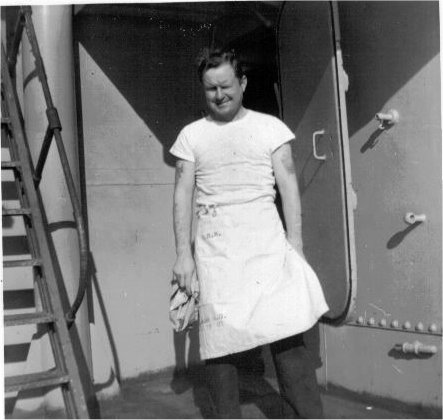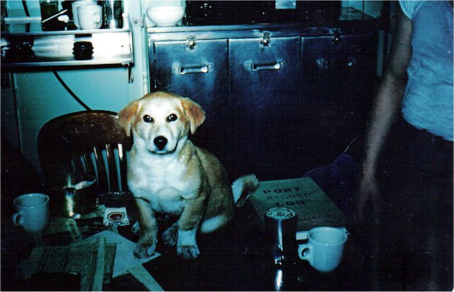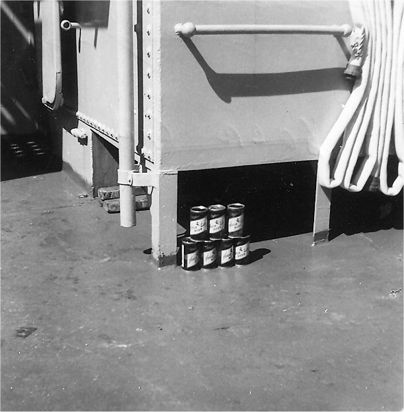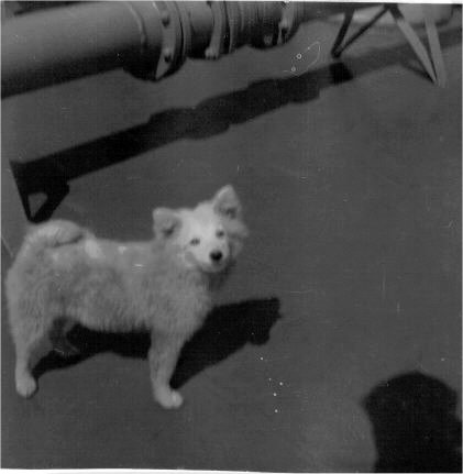 ![]() Two 2 deck hands pumping water to ship alongside (not shown), 12 December 1953 | ![]() Rex sitting in chair below deck, 1953 | ![]() YW-86 along side USS Missouri (BB-63). YW-86 pumped water to Missouri everyday in 1953 | ![]() Snowball on deck | ![]() Max sitting on table below deck, 1953 |