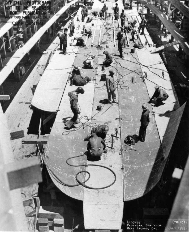 169k | Bow view of YW-103 while on the building ways, 4 July 1944. Mare Island Navy Yard photo # 4163-44. |
