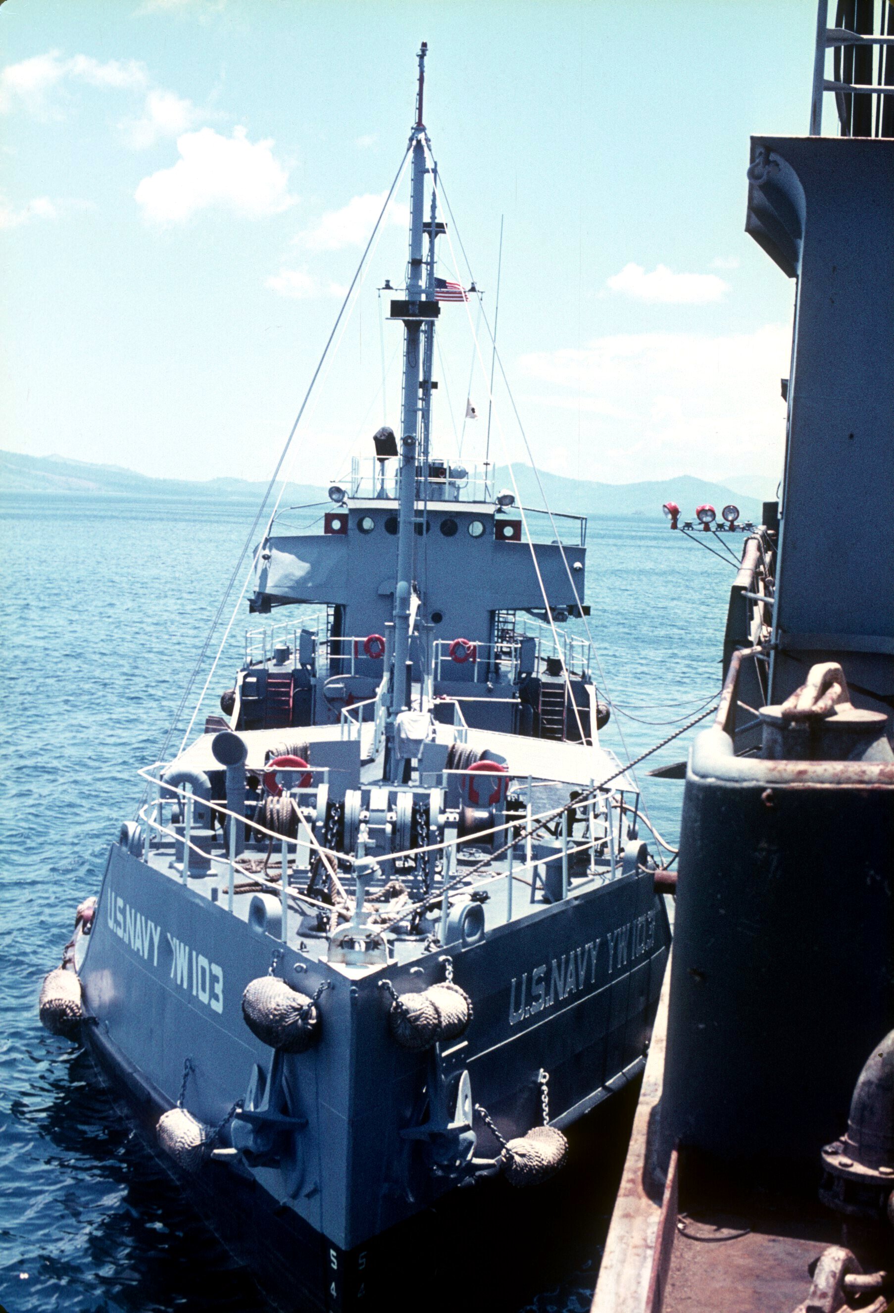 818k | YW-103 alongside USS Ashtabula (AO-51), Subic Bay, PI. 26 May 1972. Note damage to starboard bridge wing. | ©Glenn R. Sirkis MMFN, STREAM Team. A-Div. USS Ashtabula, West Pac 1971-1972. | |