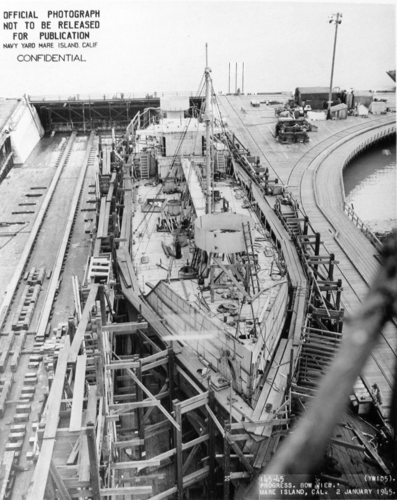179k | Bow view of YW-105 on the building ways at Mare Island Navy Yard, 2 January 1945. Navy Yard Mare Island photo # 145-44. |
