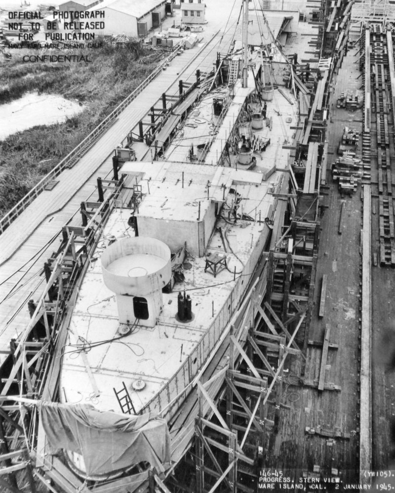 213k | Stern view of YW-105 on the building ways at Mare Island Navy Yard, 2 January 1945. Navy Yard Mare Island photo # 146-44. |