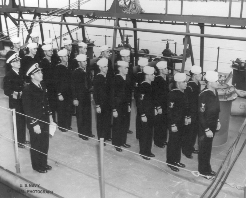 91k | Chief Bosn Thomas H. Vitaich, Officer in Charge, accepts command of YW-105 at her activation ceremony, 10 May 1945. Mare Island Navy Yard photo # 3479-44. |