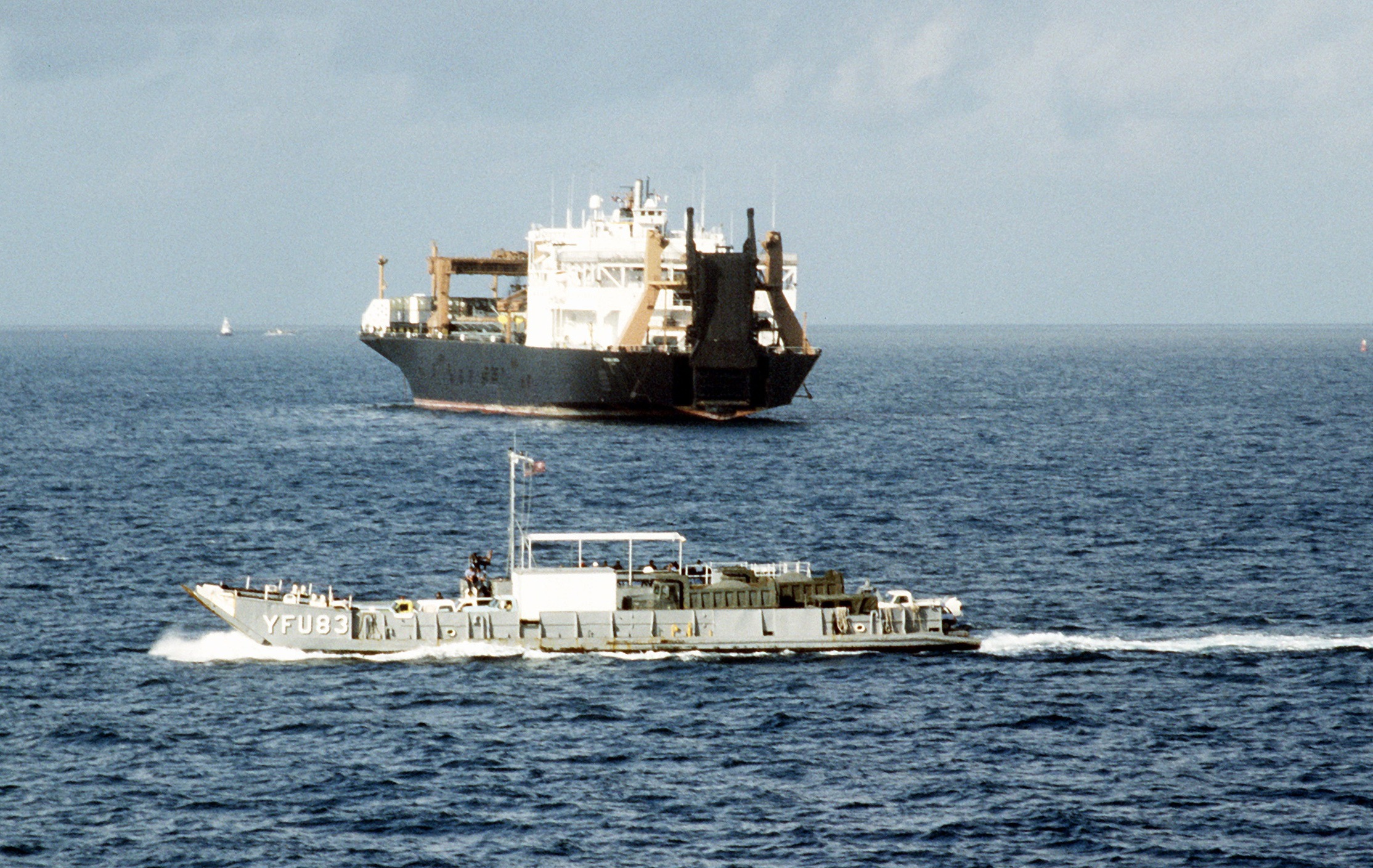 1052k | YFU-83 underway, 30 March 1988, at Naval Station Roosevelt Roads, Puerto Rico during Ocean Venture 88. Note SS PFC Eugene A. Obregon (T-AK 3006) at anchor in the background. DOD photo DM-ST-90-10214. |