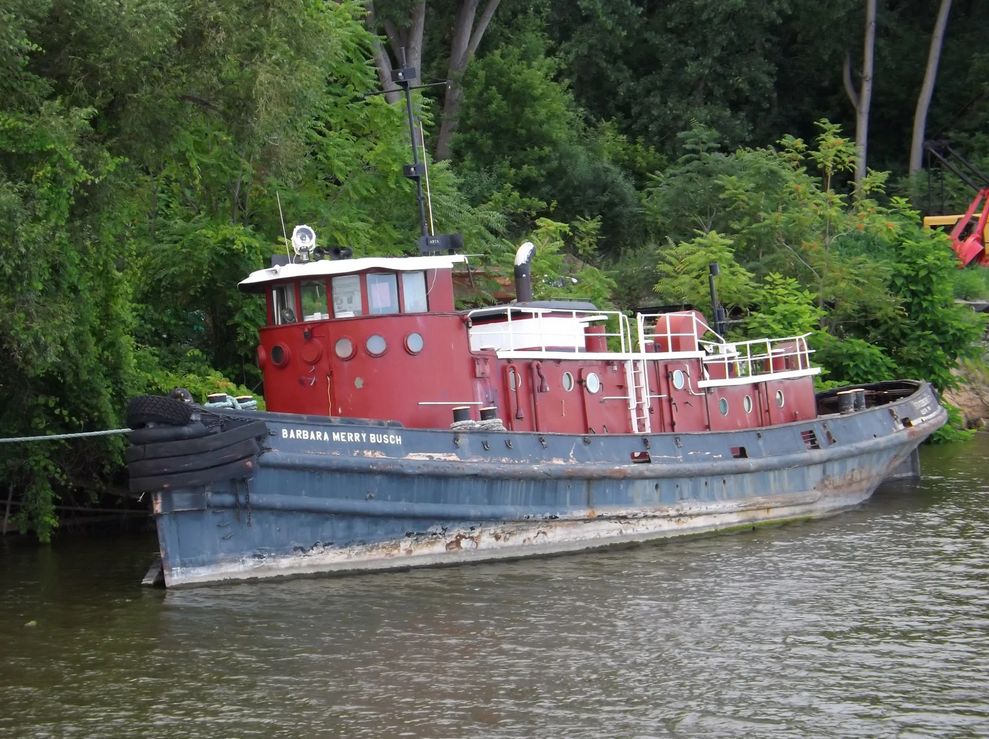 Ex-Namontack (YTB-738) as harbor tug Barbara Merry Busch lying idle at Carrollton, MI, date unknown. Note her new name has been painted on bow recently. Photo copyright Todd Shorkey via gltugs.wordpress.com |
