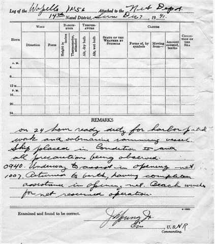 Wapello (YN-56) rough log for 07 December 1941, Pearl Harbor. |