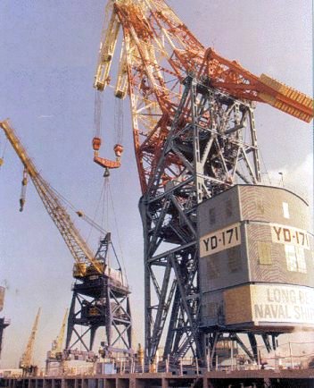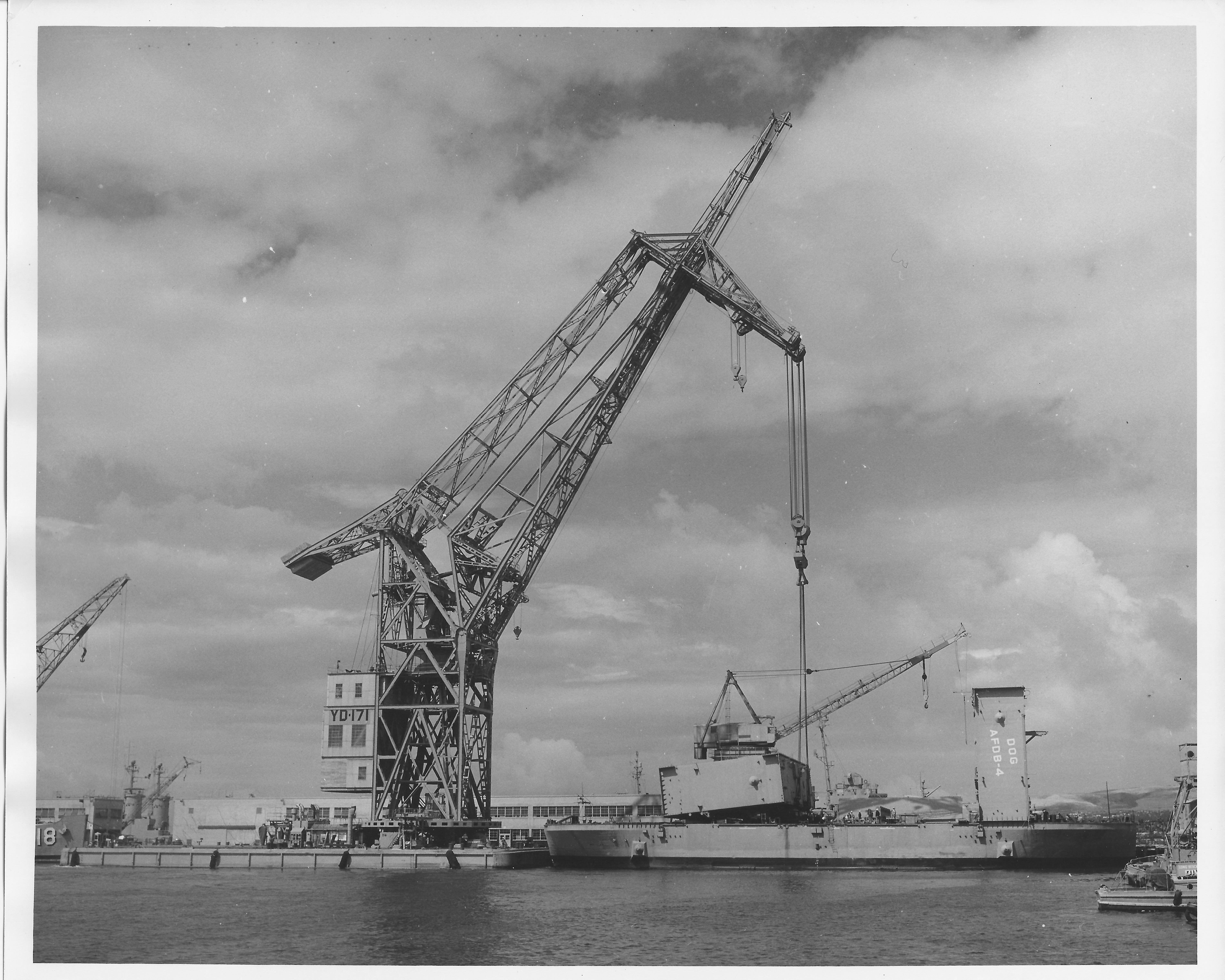 2681k | YD-171 at Long Beach Naval Shipyard lifting what appears to be a section of superstructure, into AFDB-4 circa 1953. | Larry Gauthier | ||