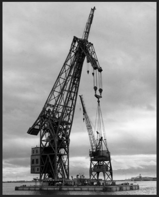 295k | YD-171 at Long Beach Naval Shipyard lifting the 425 ton barge YC-1115, circa 1947-1961 | Larry Gauthier | ||