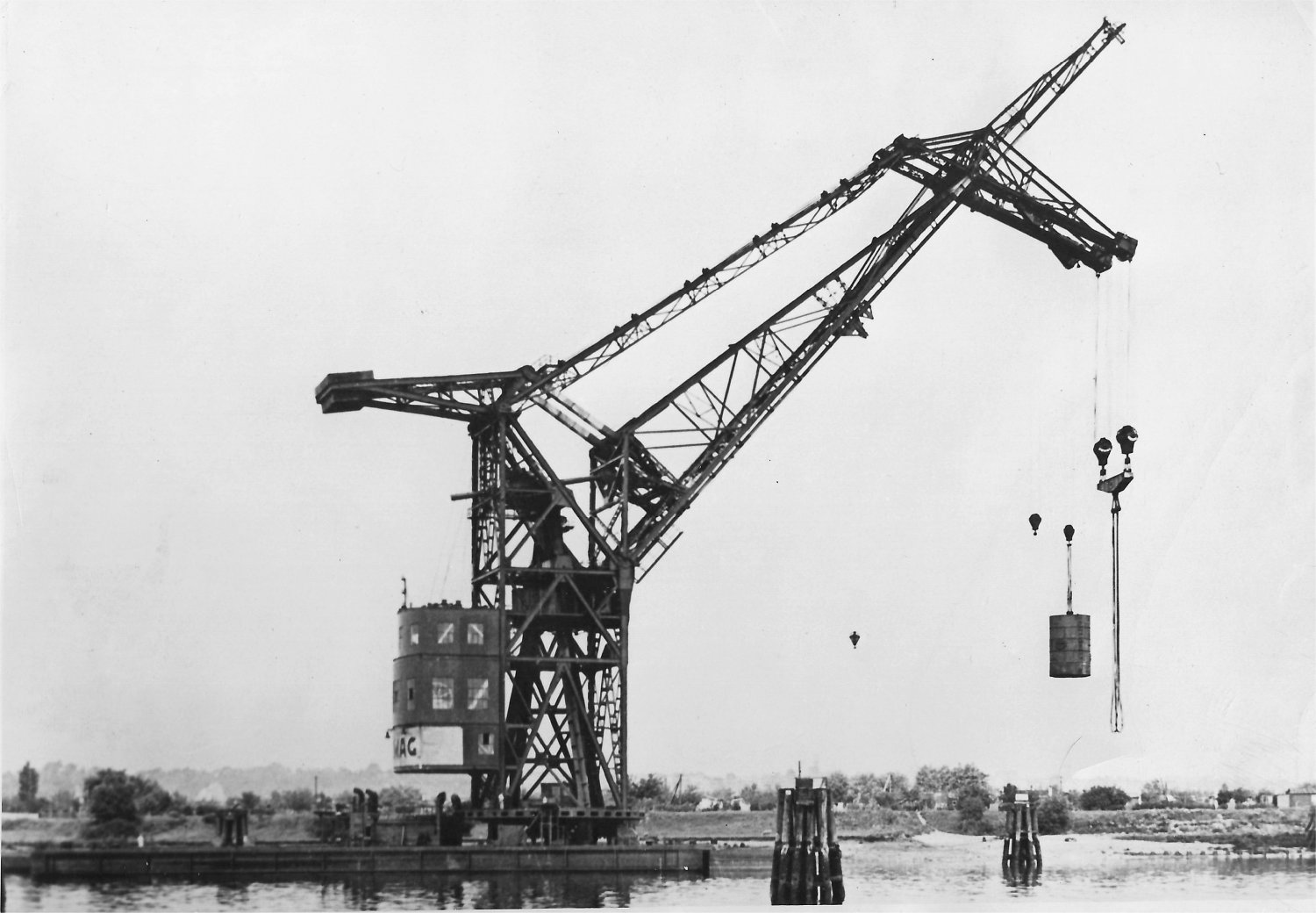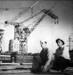 181k | Two US Navy yard workers at the Long Beach Naval Shipyard, California, in front of the former German Navy crane called "Herman the German" (YD-171), circa 1957. Photo from All Hands magazine, October 1957 |