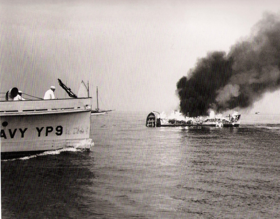 451k | YP-9 arriving on scene as a fire rages aboard the yacht Chrysolite, circa 1934, location unknown. The yacht was flying the burgee of the New York Yacht Club. Photo by Edwin Levick from the Edwin Levick Collection, Mariner’s Museum, Newport News, VA |
