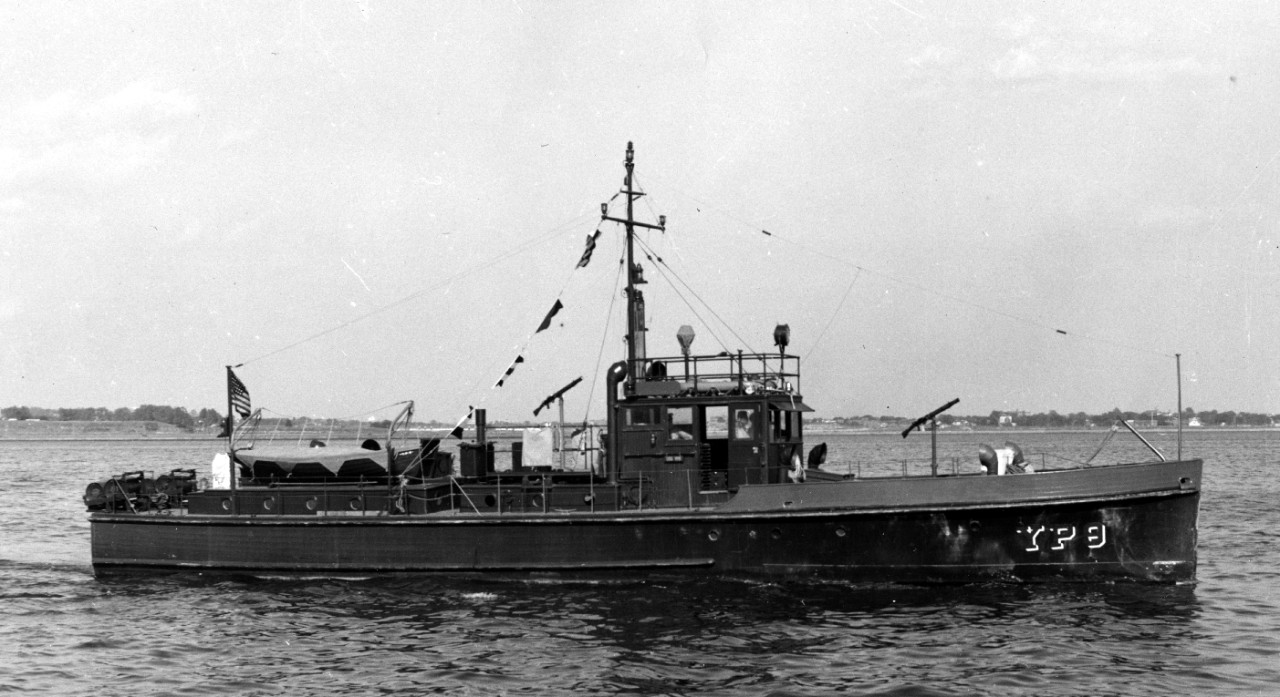 199k | YP-9 underway after conversion, circa 01 October 1941. She appears to be painted in Measure 1 (Dark Gray), but with an oddly rendered identification number, the shadowing being in white. She carries two .30-caliber Lewis machine guns, and close investigation of the photograph reveals the boat on her after deckhouse to be carrying a white YP-9 with an arrow through it, the symbol of an officer’s gig. A life raft is secured to the chart house roof. Bureau of Ships Photograph BS-25274, National Archives and Records Administration, Still Pictures Division, College Park, MD |