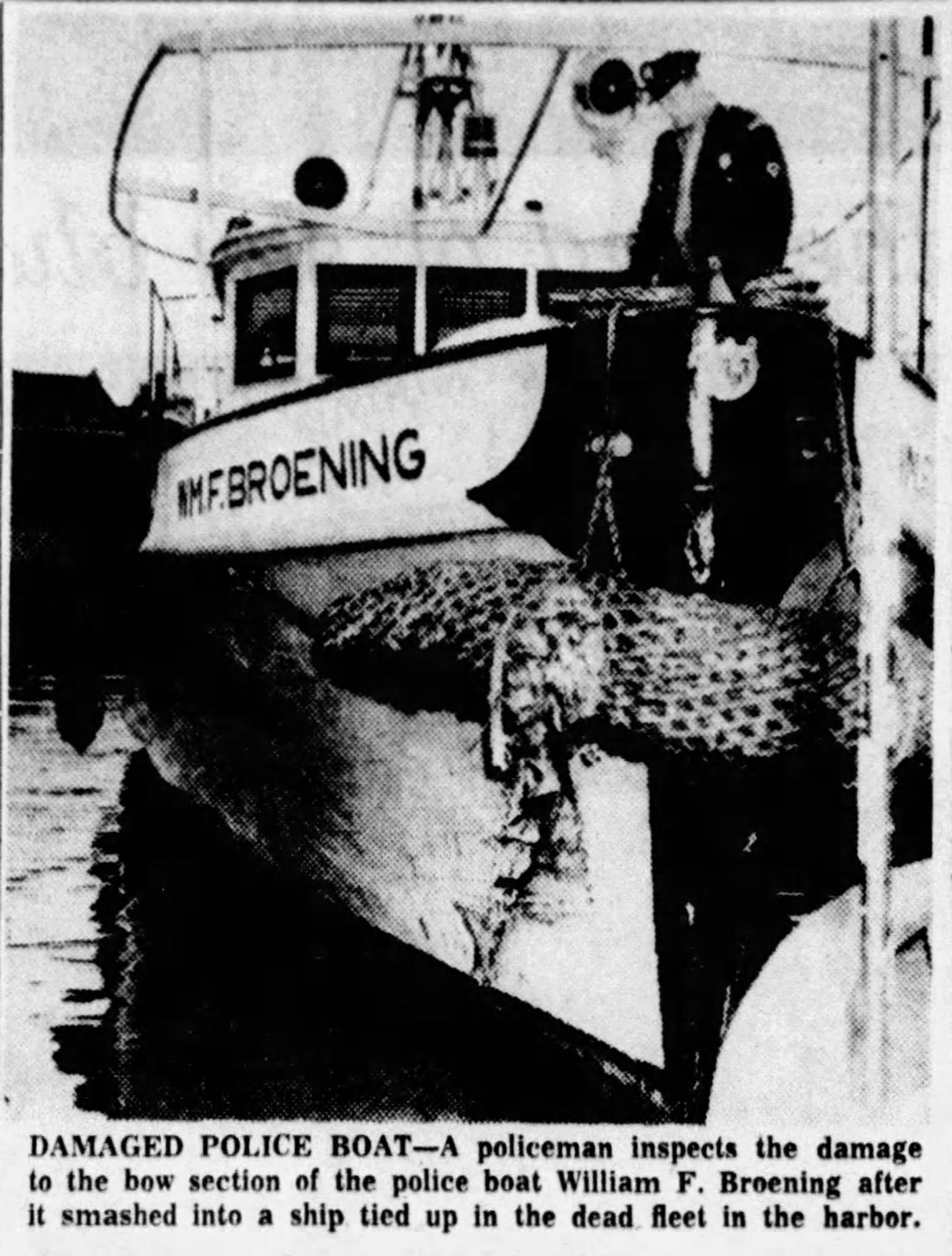 335k William F. Broening showing bow damage after the clutch seized and it ran into a vessel of the "mothball fleet" anchored near Hawkins Point, Baltimore.