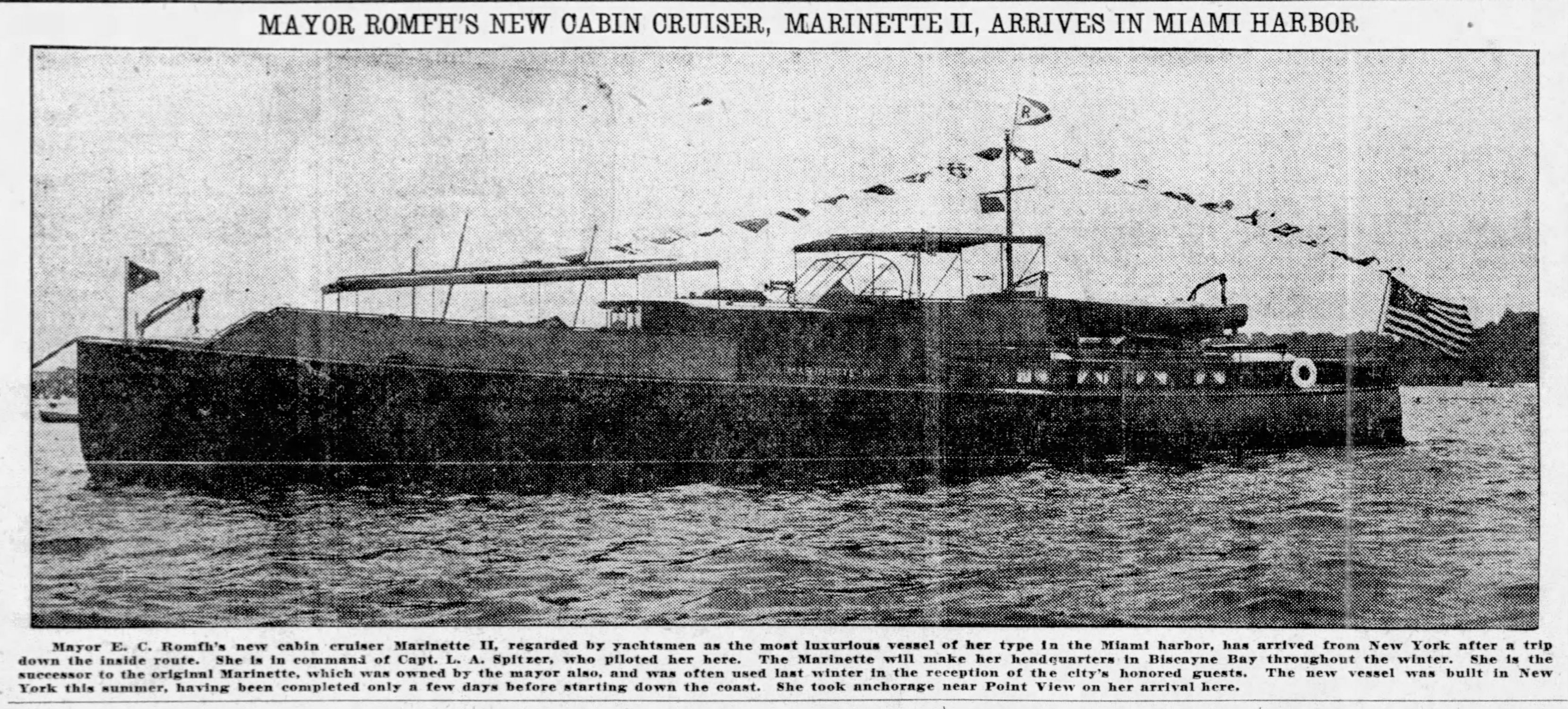 803k | Marinette II making her arrival at Miami, FL, October 1926. Photo from Miami Herald, 30 October 1926. |