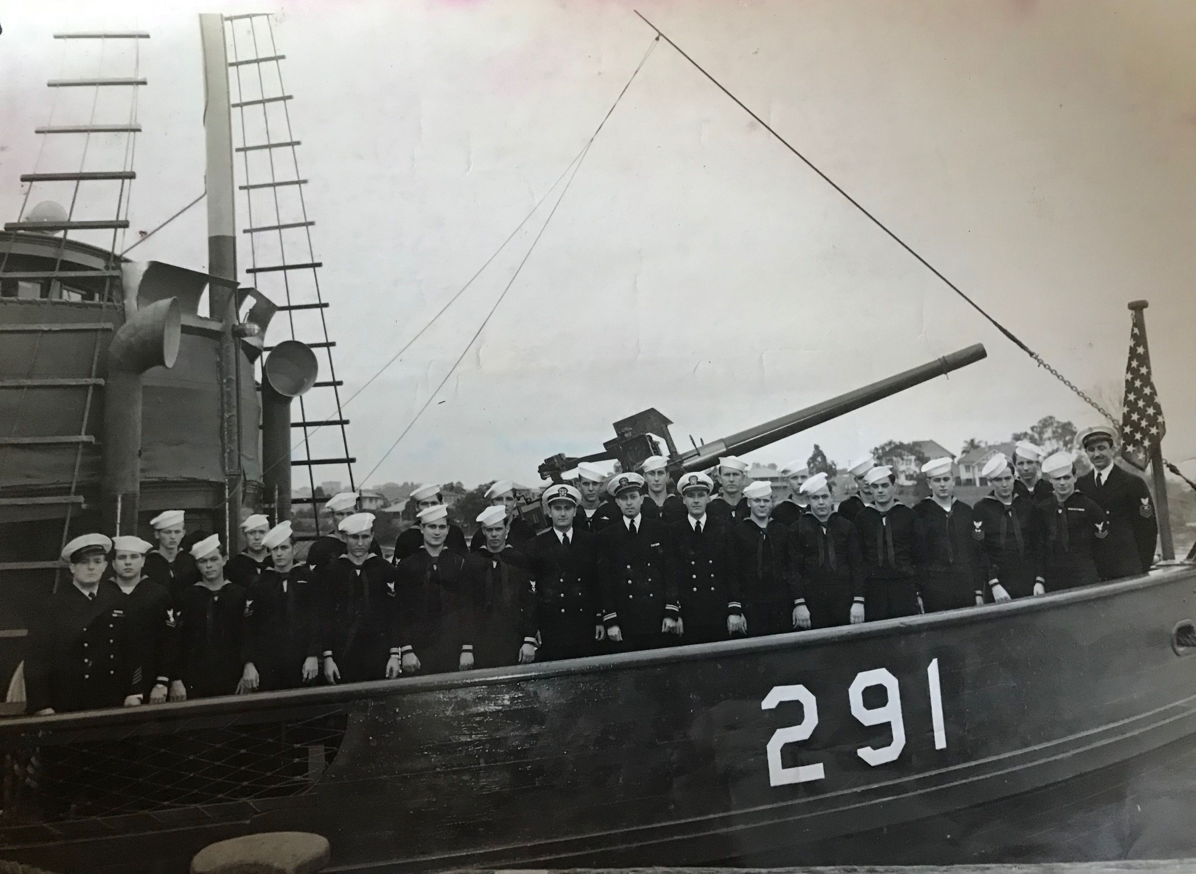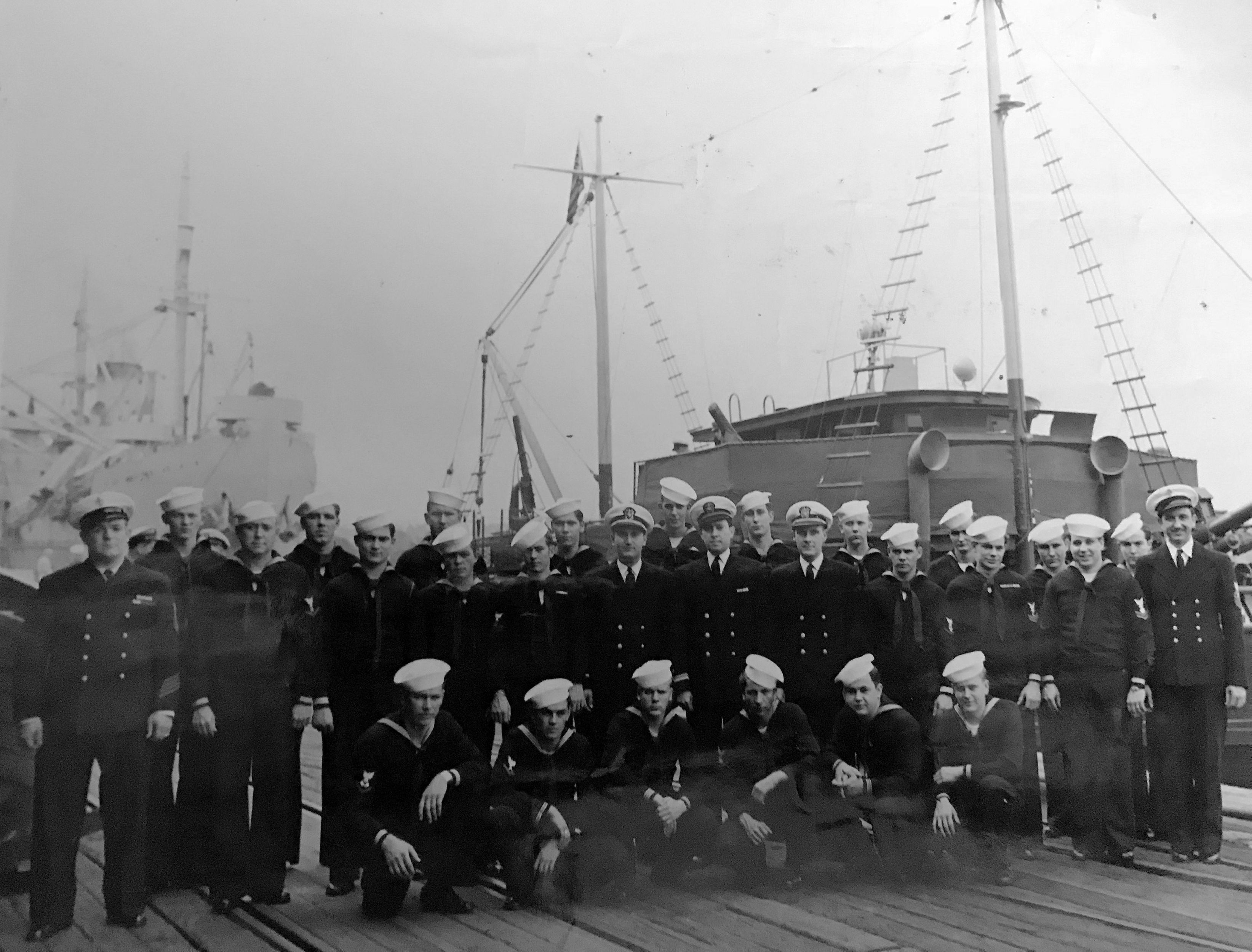 Officers and crew of YP-291 date and location unknown. Note the 3"/50 gun mounted on the bow. |