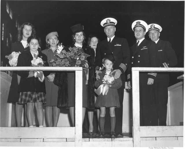 YP-627 42k Dignitaries on the platform for the launching of YP-627, 14 October 1944, at Western Boat Building Co, Tacoma WA.