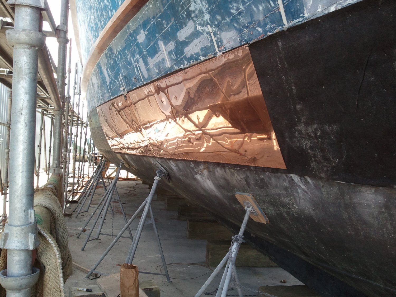 YP-655 hauled out of the water at Galveston, TX. during a 2 ½ month overhaul. Repairs included replacing all the rub and splash rails, replacement of two frames and all strut blocks in the lazarette and repainting of the hull haze gray. This photo, dated 12 April 2013, shows the replacement of 50 feet of copper sheathing on her bottom. |