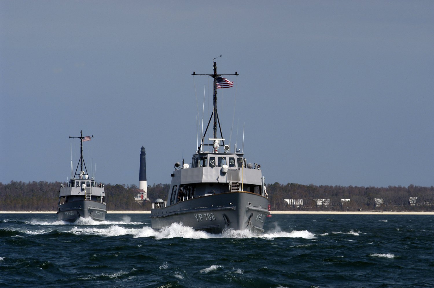 178k | YP-702 and YP-696, depart NAS Pensacola, FL., 21 March 2005, for the last time to join the fleet of yard patrol boats at the Naval Academy at Annapolis, MD. The yard-patrol boats will be used to help train future generations of midshipmen in basic seamanship, boat handling and navigation. US Navy photo # 050321-N-5328N-002 by Gary Nichols. |