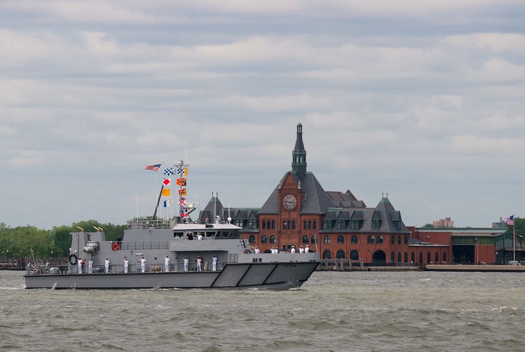 82k | YP-704 underway on the Hudson River, passing the Central Rail Road of New Jersey Terminal at the start of Fleet Week, New York, 20 May 2015. Photo copyright "Ho Hokus" (real name unknown) |