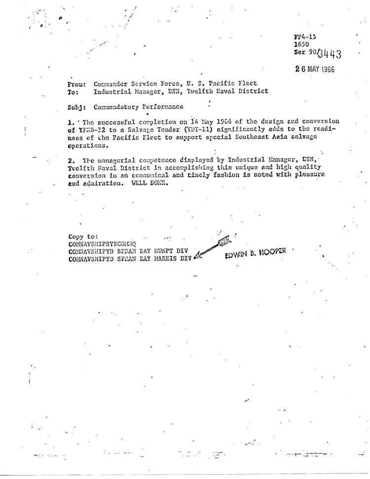 72k | Letter of 26 May 1966, from Service Force Pacific U.S. Pacific Fleet to Industrial Manager, USN, 12th Naval District commending the latter for the successful design and conversion of YFNB-12 to YDT-11 | Darryl Baker | |