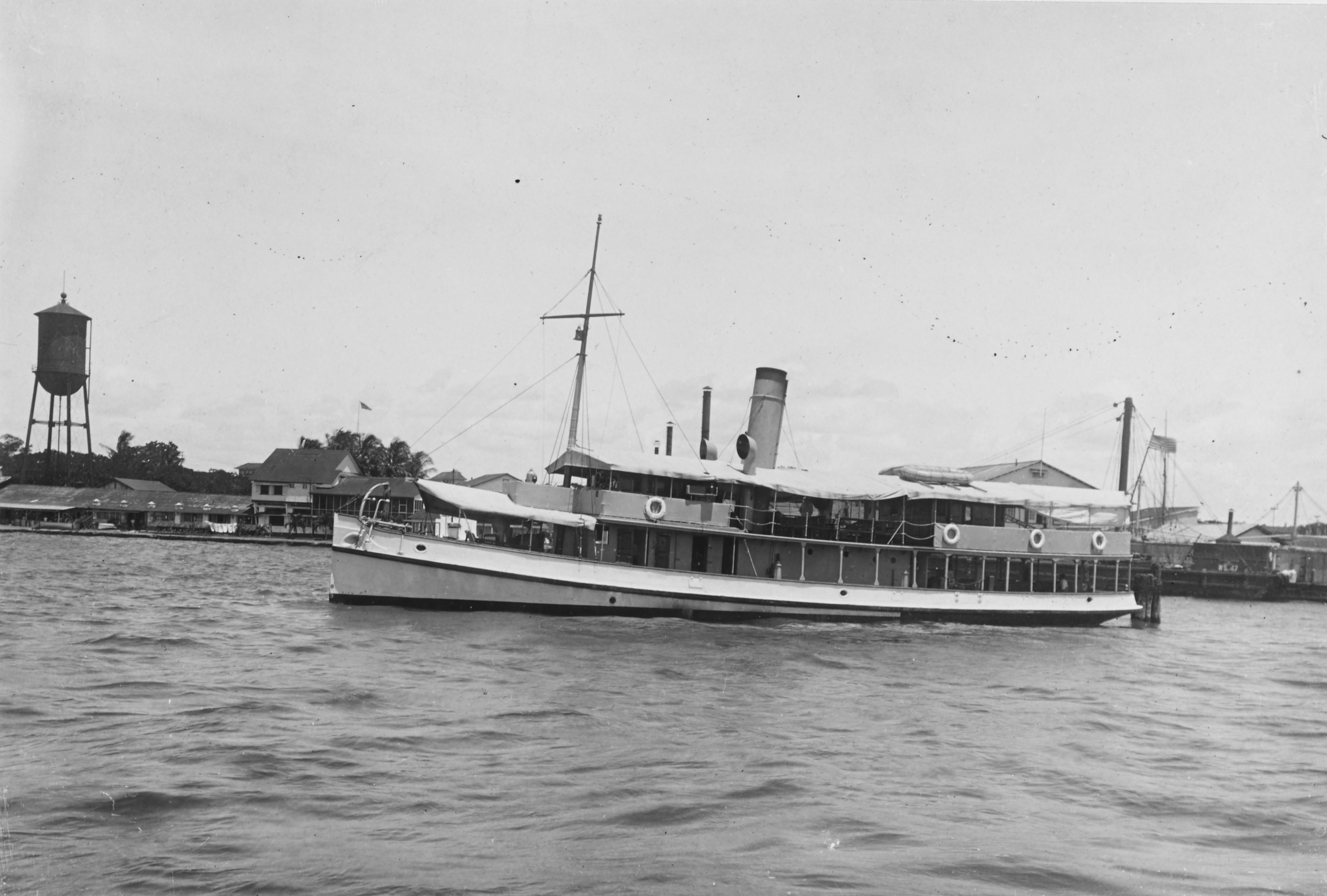 San Felipe underway off Cavite Navy Yard, Luzon, Philippines, circa 1920s or 1930s. Floating derrick YD-47 is just visible dockside at right.