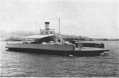34k | Nihoa (YFB-17) carries autos, trucks, and sailors from Ford Island to Oahu during one of the ferry's hourly 'voyages', circa 1953-54. Photos from All Hands magazine, February 1954. |
