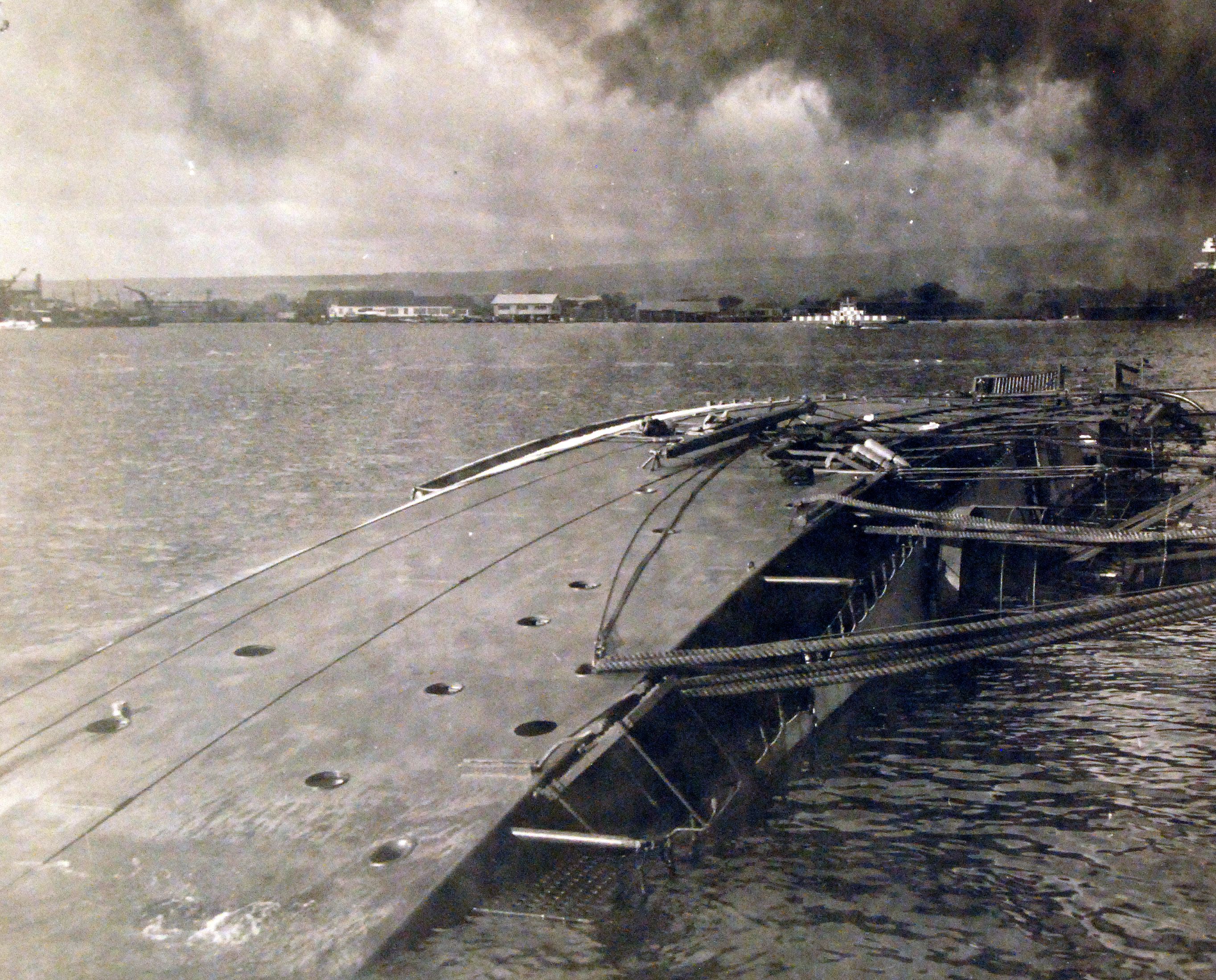 1036k | Nihoa (YFB-17) is just visible above the capsized Oglala (CM-1) shortly after the Japanese attack on Pearl Harbor, 07 December 1941.Note her original 'checkerboard' paint scheme, designed to make her more visible in the busy harbor. National Archives photo 80-G-32532 |
