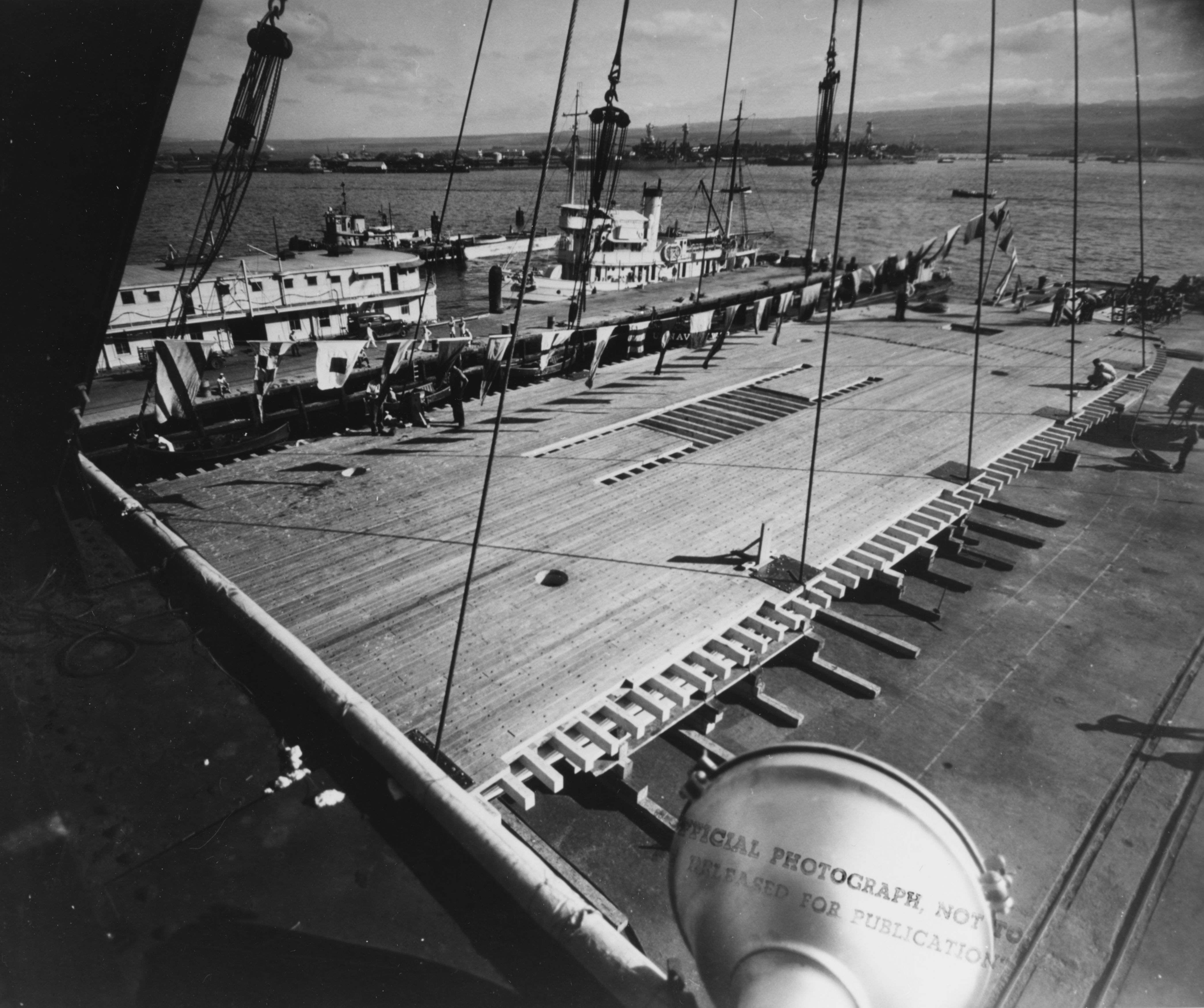 1029k | Nihoa (YFB-17) underway at Pearl Harbor, probably on final trials before delivery, 03 November 1941. Her high visibilty 'checkerboard' paint scheme is very evident here. National Archives photo 19-N-26268A |