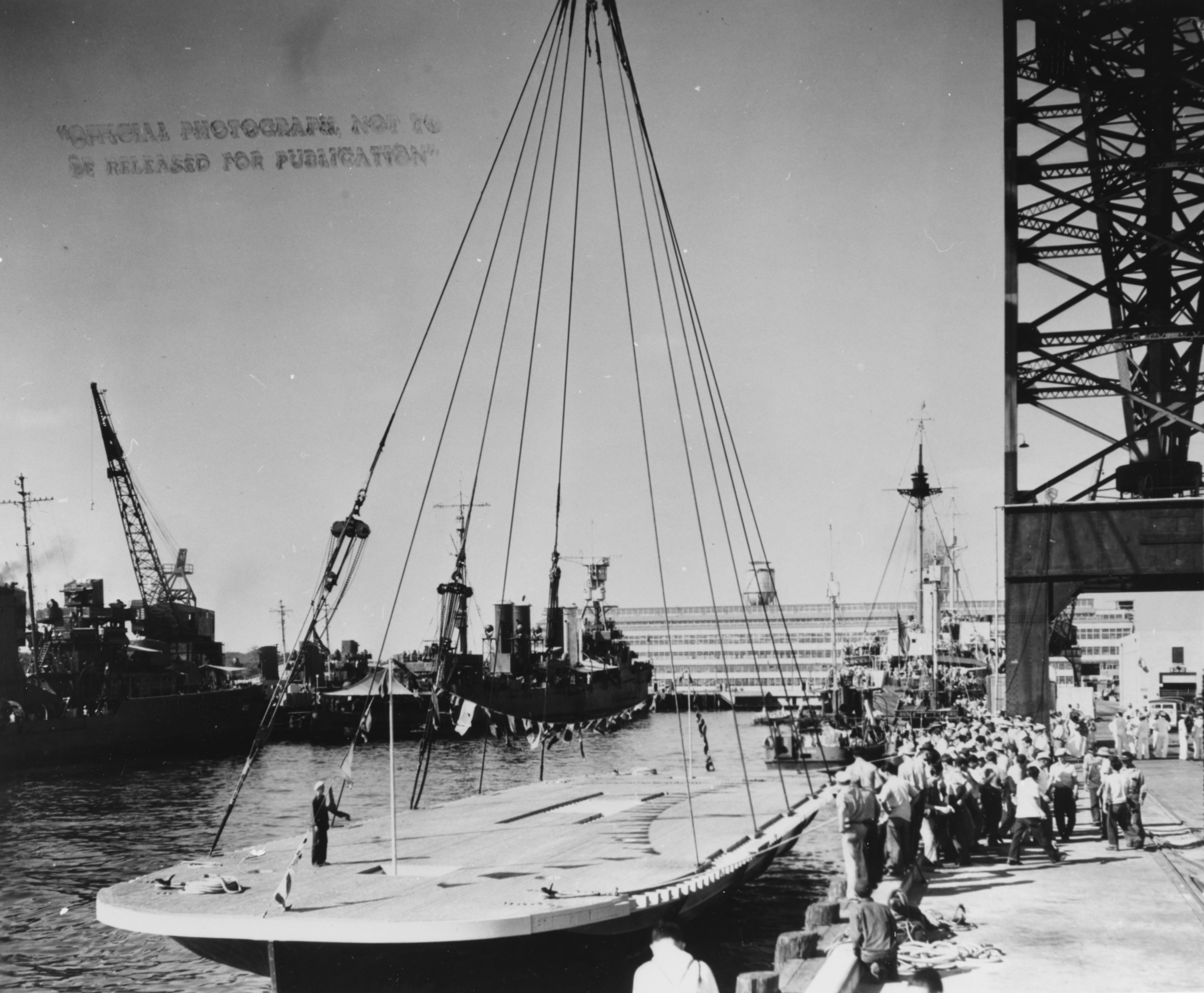 993k | Nihoa (YFB-17) being "launched" by crane at 1010 Dock, Pearl Harbor Navy Yard, 25 July 1941.Ships in background include McCall (DD-400) and Reedbird (AMc-30)
