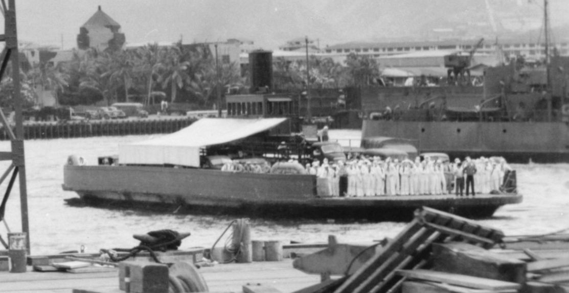 1222k | Nihoa (YFB-17) carries autos, trucks, and sailors from Ford Island to Oahu during one of the ferry's hourly 'voyages', circa 1950-1960. Original caption "BATTLE WITNESS- The Ford Island ferry, which still shuttles across Pearl Harbor, was caught in the middle of the harbor during the 1941 attack. Though cruising amidst bombs and torpedoes, the ferry completed its run unharmed." US Navy photo |