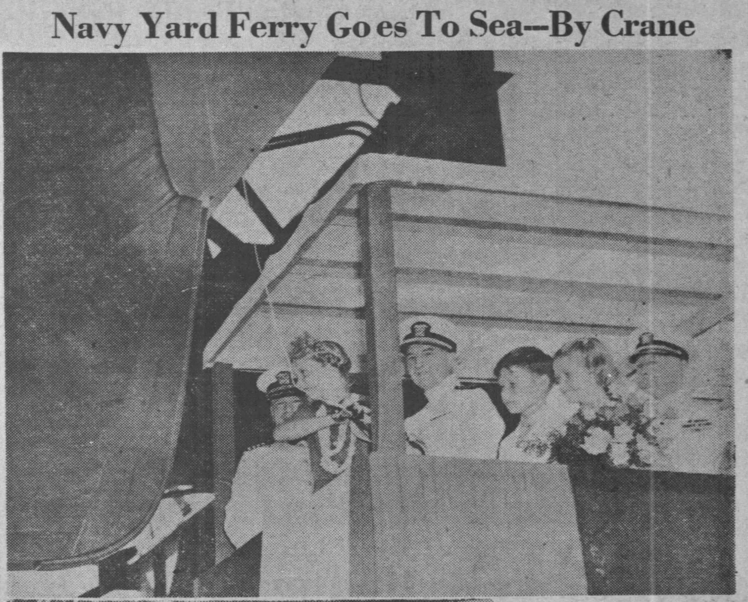 800k | Nihoa (YFB-17) being christened by Miss Patricia Bellinger, daughter of Rear Admiral Patrick N.L. Bellinger, at Pearl Harbor Navy Yard, 25 July 1941. The christening party consisted of (from right): Captain Claude S. Gillette, manager of Pearl Harbor Navy Yard; Miss Bellinger, wielding the traditional bottle; Captain Charles D. Swain, production officer;