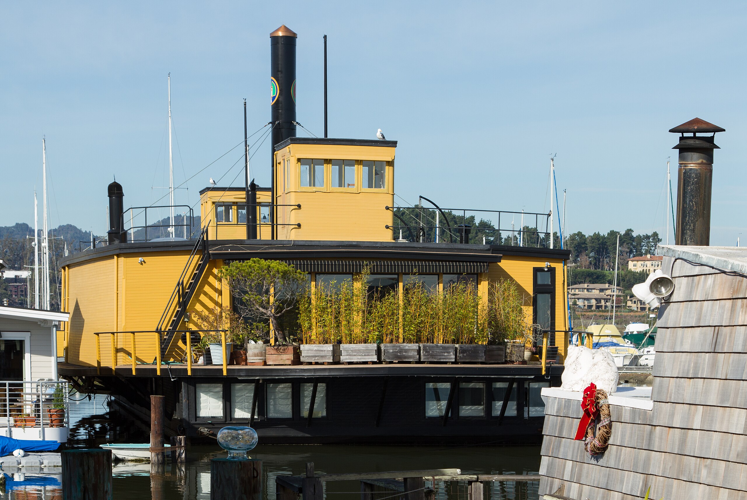 Former ferry City of Seattle, mounted on pilings and painted yellow, in use as a house and office for the owner of a marina known as the Yellow Ferry Harbor in Sausalito, CA. Photo taken by Frank Schulenburg, 03 December 2012. Photo via Wikimedia Commons, Creative Commons Attribution-Share Alike 3.0 Unported |
