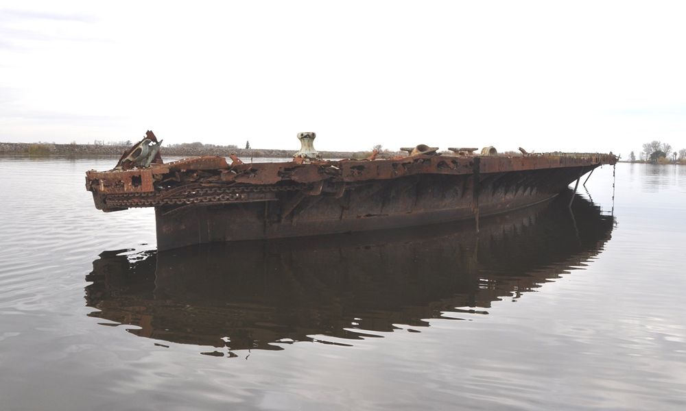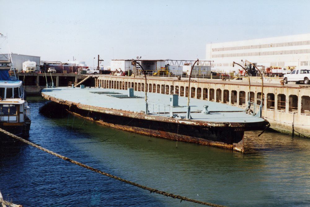 Stripped hull of San Leandro at Richmond, CA, 30 August 2001. Photo copyright George Schneider |