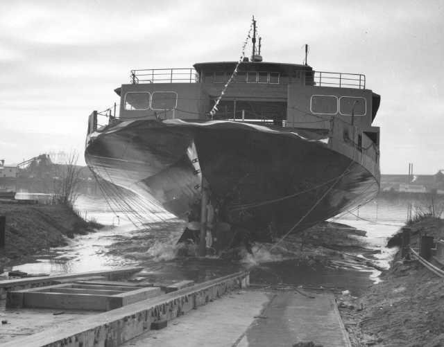 36k | Moko Holo Hele (YFB-87) gets her bottom wet for the first time as she reaches the waters of Puget Sound as she is launched at Western Boat Building, 18 December 1969. Photo from Richard's Studio Collection, Tacoma Public Library |