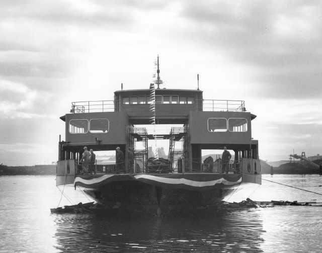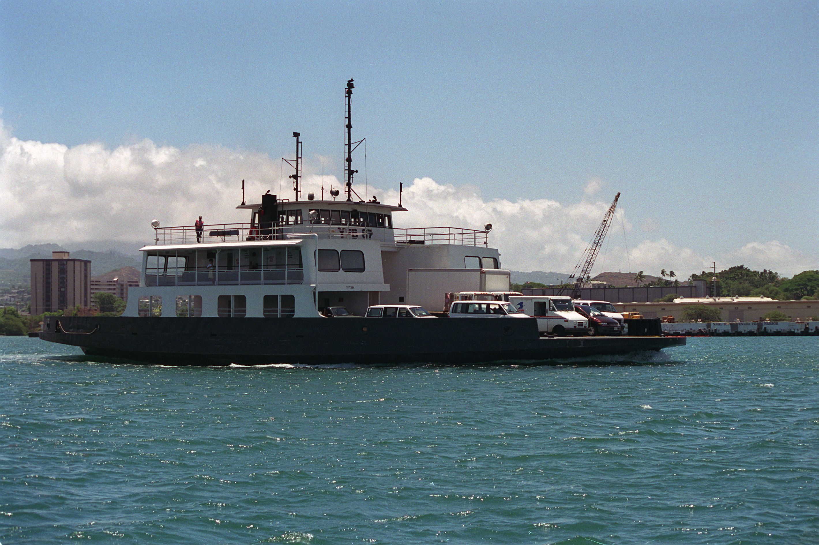 110k | Moko Holo Hele (YFB-87) and Delaware Valley (YFB-83) docked off Hornet Ave., Pearl City, HI, date unknown. Library of Congress item # hi0648.365739p, taken by David Franzen |