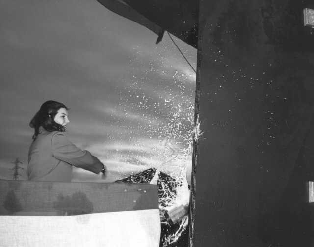 27k | Mary Petrich christens Moko Holo Hele (YFB-87) at Western Boat Building, Tacoma, WA, 18 December 1969. Photo from Richard's Studio Collection, Tacoma Public Library |