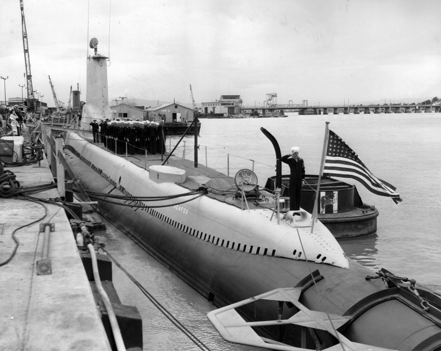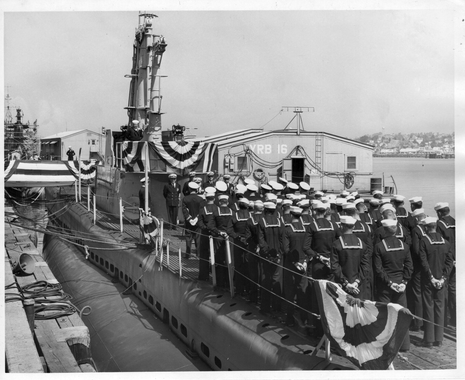 259k | Recommissioning of USS Sea Fox (SS 402) at Mare Island Naval Shipyard, 5 June 5, 1953. The Submarine forward of Sea Fox is USS Menhaden (SS-377) with YRB-12 and YRB-14 outboard of her. Vallejo Naval & Historical Museum File # SS 402 17775-6-53 TH, 6/5/53/font> |