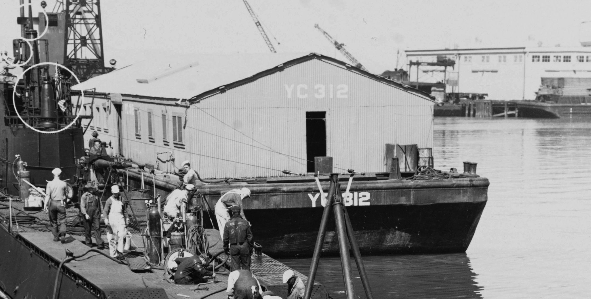102k | YC-312 moored forward of Porpoise (SS-172) at Mare Island, 13 October 1942 National Archives photo 19-N-35999. |