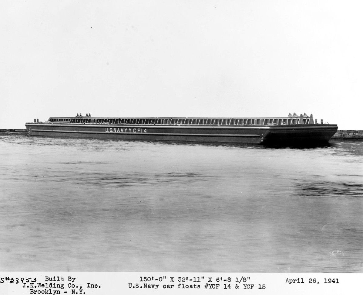 YCF-14 as completed at builders, 26 April 1941. National Archives photo 19-N-23953, submitted by Mike Green. Built by J.K. Welding, Brooklyn, NY Laid down, 14 December 1940 Launched, 26 March 1941 Completed, 01 May 1941 Placed in service, date unknown Allocated to Washington Navy Yard Placed out of service, date unknown Struck from the Naval Register, 01 August 1976 Sold for scrap, 08 December 1977 Displacement 174 tons; Length 150'; Breadth 33' 6" |