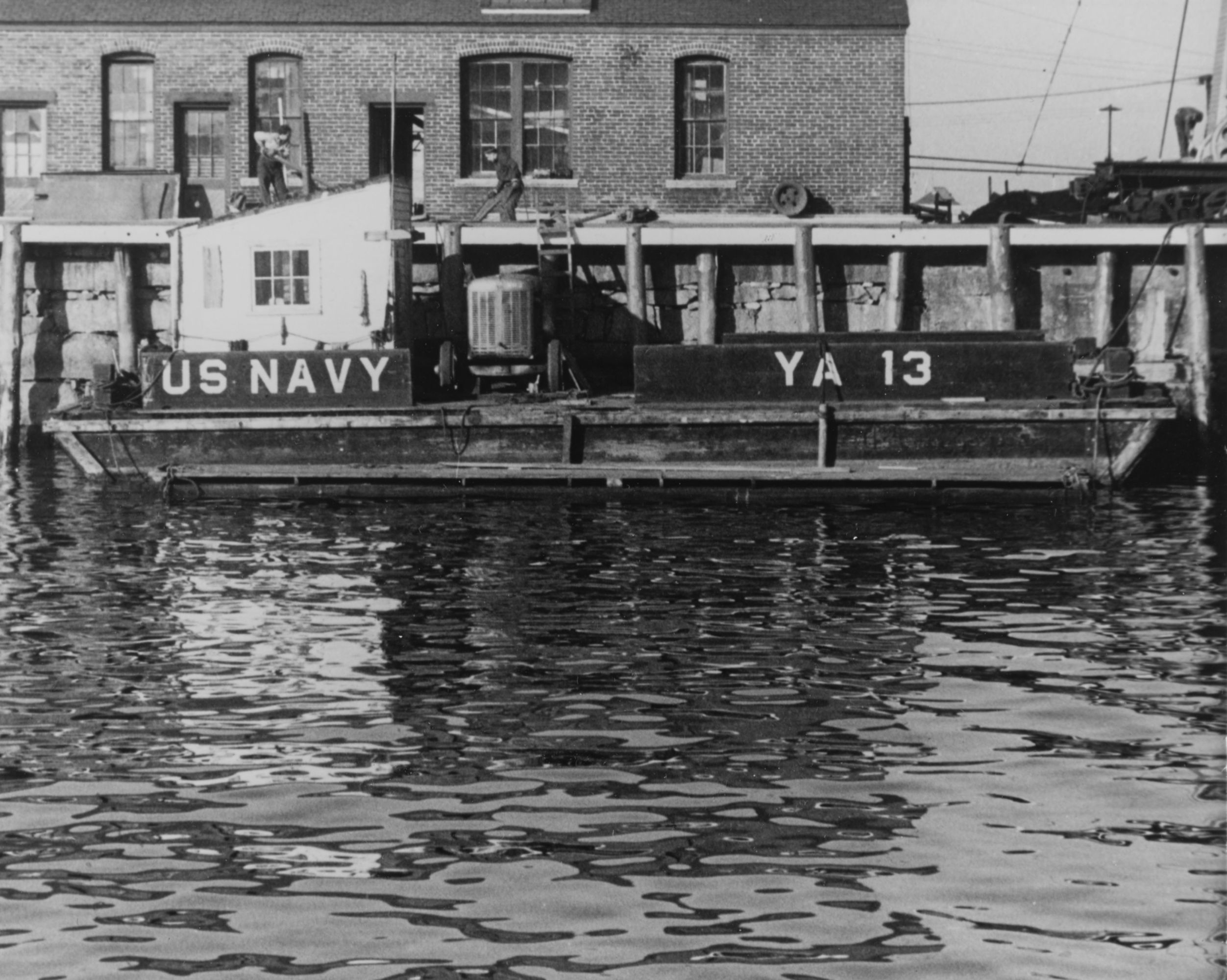 YA-13 moored at Boston Navy Yard, 1941.She appears to be in use as a diving tender; note portable compressor amidships.