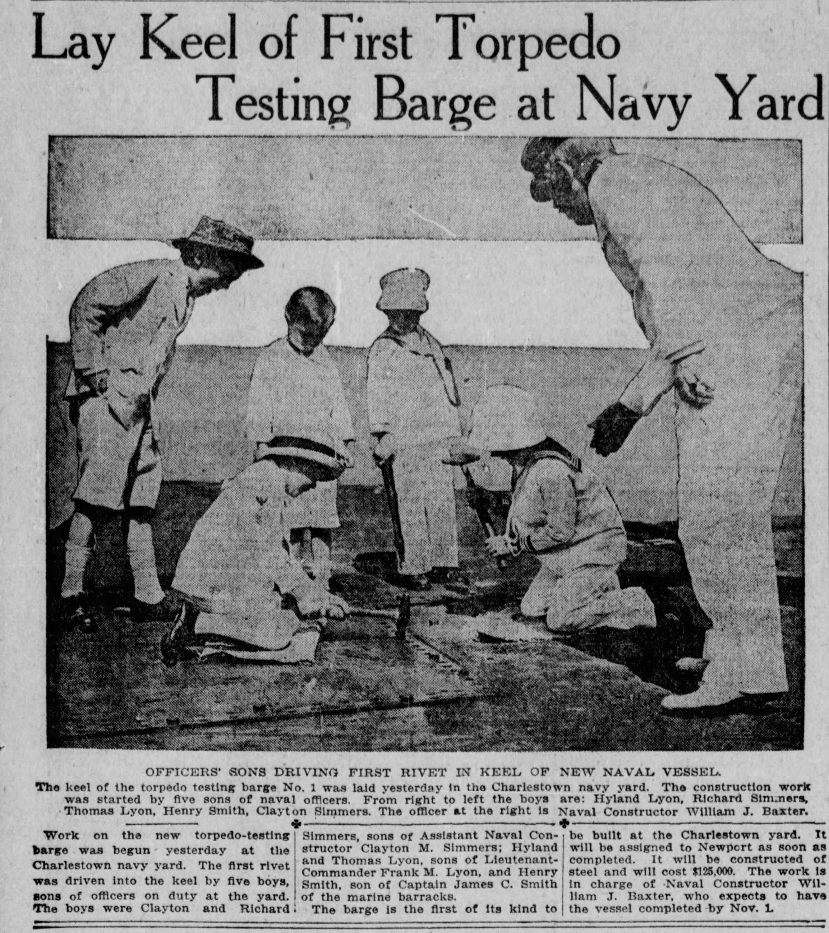 7k | Article about the keel-laying of Torpedo Testing Barge # 2 at Boston Navy Yard, 30 August 1916. Note the article gives the wrong hull number. From Boston Post, 31 August 1916 |