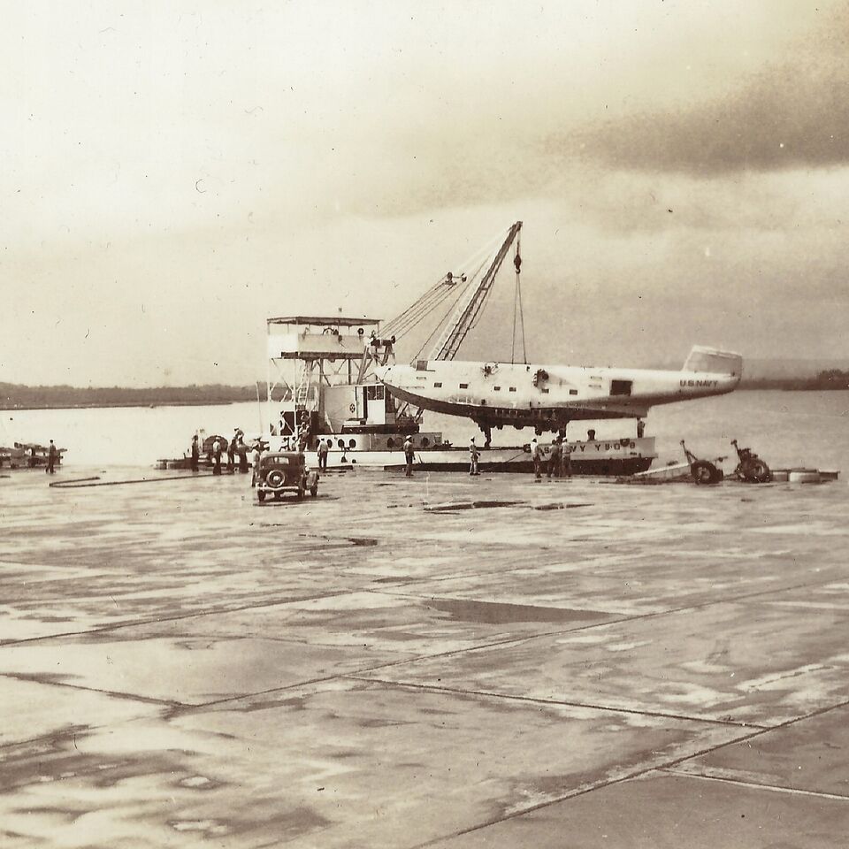 YSD-8 handling the hulk of the wrecked experimental seaplane Hall XP2H-1 at NAS Coco Solo, 1935. The original caption for the photo reads: "Hull of Navy 'Mystery' Plane XP2H-1. She split her engine mounts and buckled the hull while trying full load takeoff. Being loaded aboard 'Mary Ann'