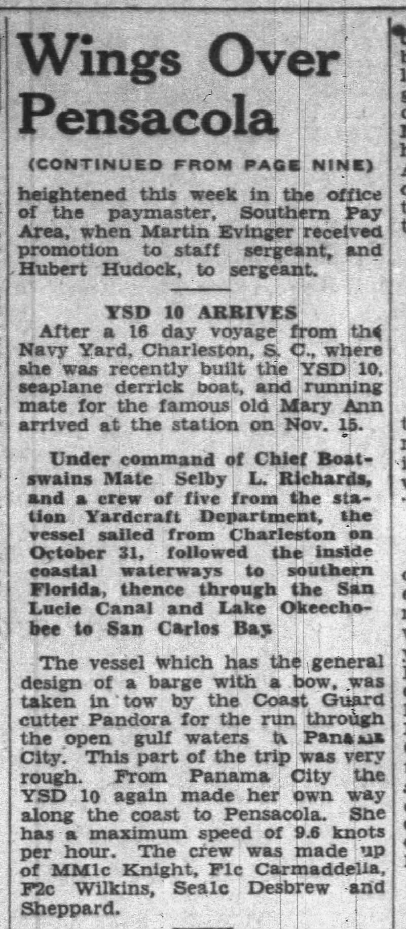 256k | Article about the arrival of YSD-10 at Pensacola, from Pensacola News Journal, 24 November 1940. | David Upton | |
