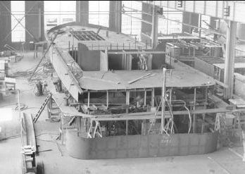 23k | YSD-11 under construction in the Assembly Shop, at Boston Navy Yard, 05 July 1940. Boston National Historical Park Collection, NPS Catalog No. BOSTS-11126. |
