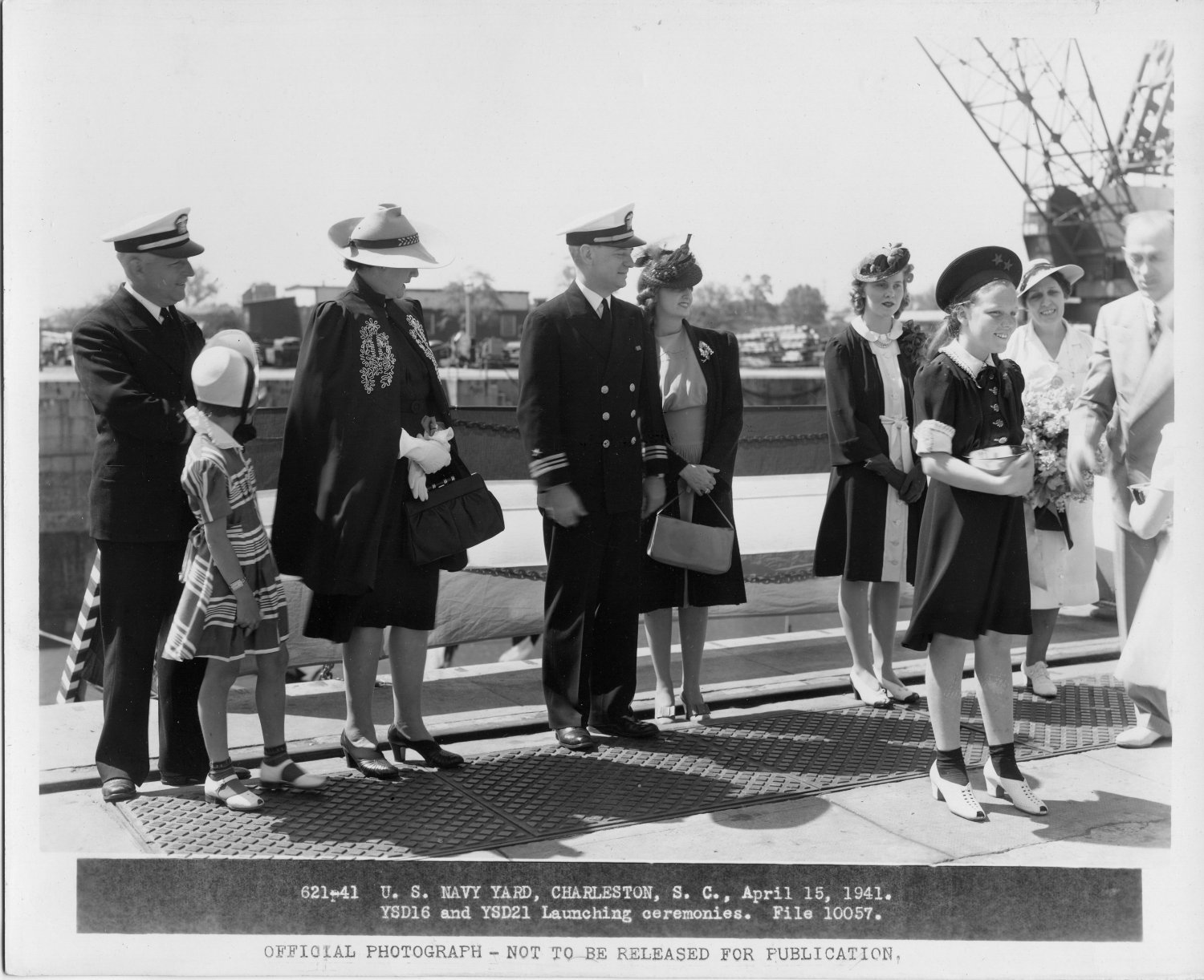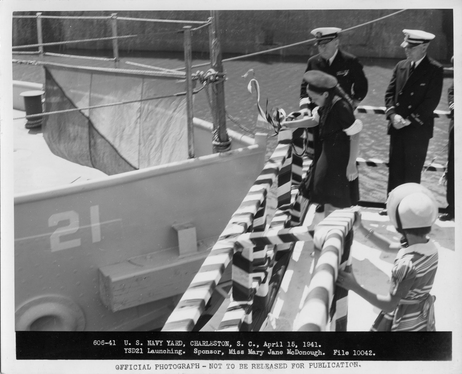 270k | Launching of YSD-21 at the US Navy Yard Charleston, S. C., 15 April 1941. YSD-21 was sponsored by Miss Mary Jane McDonough. Mary Jane McDonough-Berry passed away 26 Dec 2013. | Jim Lilco | |